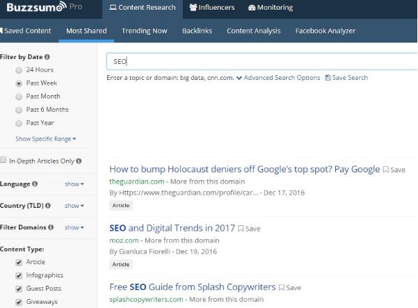Buzzsumo’s “Content Research” section provides a great starting point for your list research. If you are a blog that writes about SEO, you want to be outreaching to blogs who publish similar content.