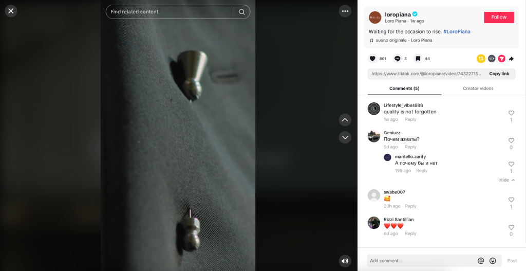 You can see similar examples of this social media strategy from luxury brands like Loro Piana, which use every available opportunity to present their visually stunning products in a positive light, generating both awareness and aspirational value.
