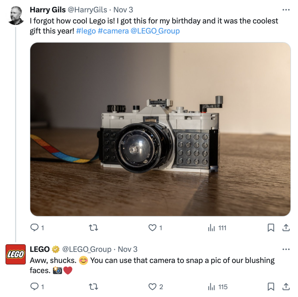 Something as simple as engaging in meaningful follower interactions — as done by Lego on X — is an excellent way to show there are real humans behind your social profiles. Plus, it’s a great method of showing you genuinely care about your followers’ experience with your brand and products — a crucial brand attribute to demonstrate when investing in brand awareness.