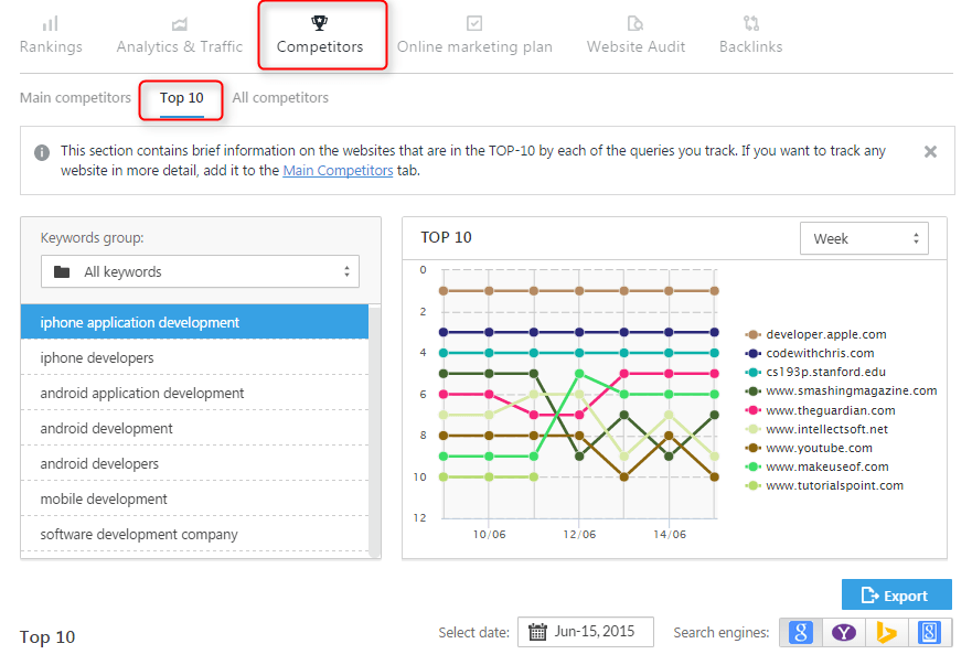 To monitor the competition, you can use SE Ranking, which has competitor monitoring and reporting tools. You can also use tools such as Tweetdeck to keep an eye on mentions involving competitors.