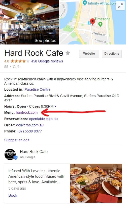 I used the globally recognised Hard Rock Cafe as the center of my research and even they don’t have their “menu items listed under either “Menu” or “Services”. Next to the ‘Menu’ title, you can see a link to their menu, but not a list of their actual menu items, as was seemingly promised: