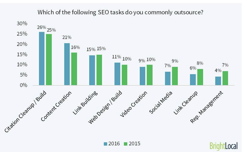 BrightLocal ranked citation cleanup/building as the most commonly outsourced SEO task. This is due to its tedious and time-consuming nature. Often businesses will outsource this task in order to focus on other aspects of SEO, and therefore being able to boost their productivity.